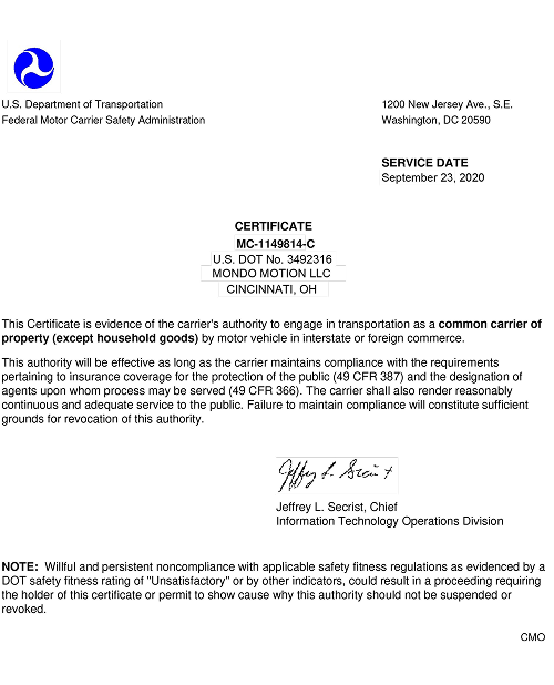 Mondo Motion LLC operates as a fully authorized interstate motor carrier under the regulations of the Federal Motor Carrier Safety Administration (FMCSA), a division of the U.S. Department of Transportation (DOT).